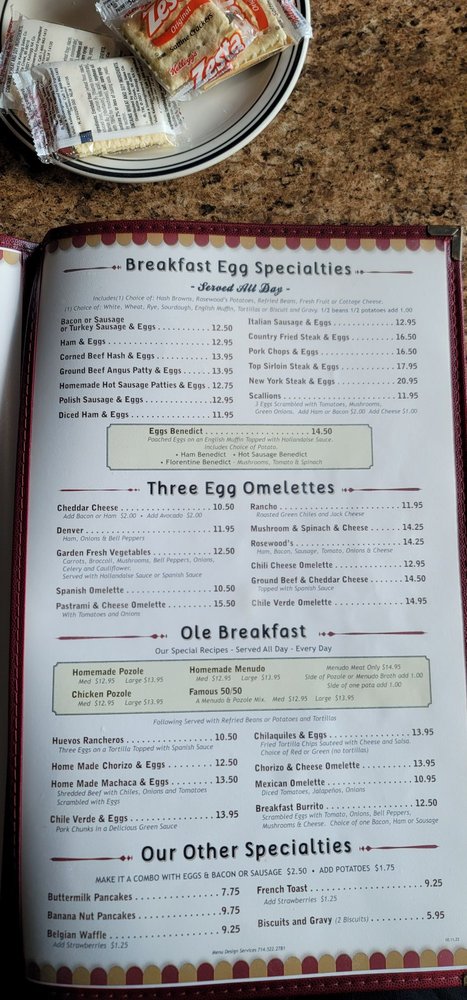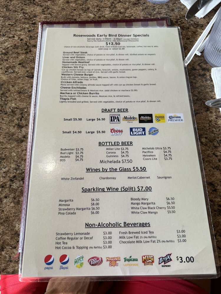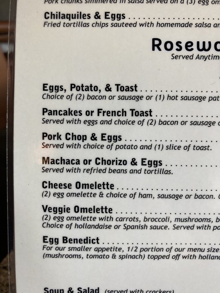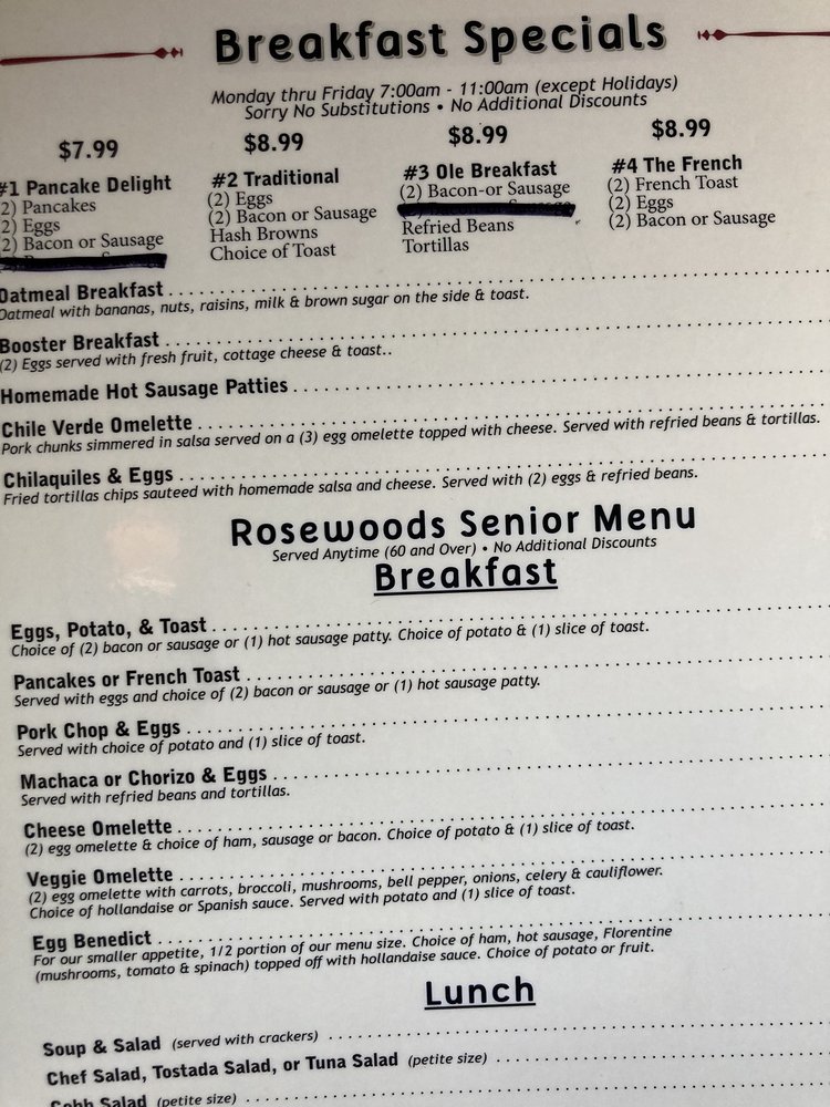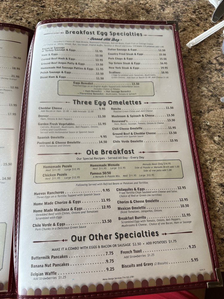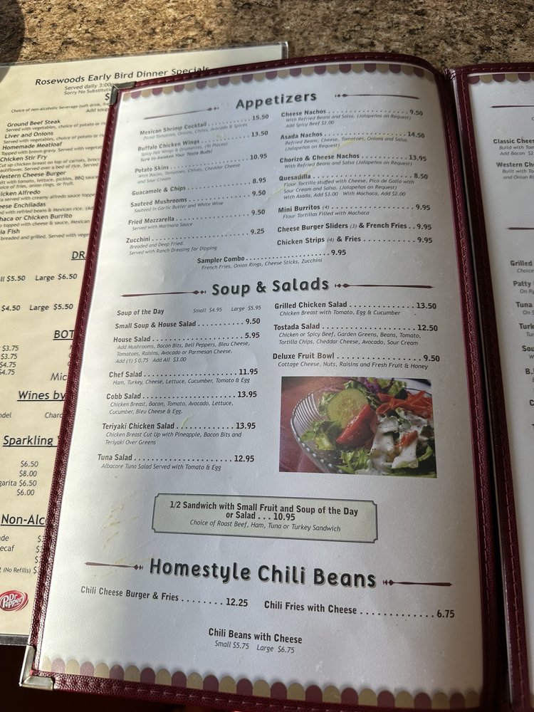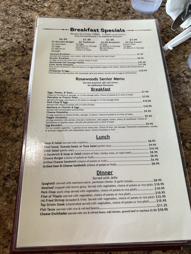 Introducing the menu at Rosewoods Family, a cozy diner in Cerritos, CA, offering a range of breakfast, brunch, lunch, dinner, and dessert options. Known for their friendly staff and traditional American fare, Rosewoods is a favorite spot for many locals. Their famous 50/50 dish and flavorful chilaquiles receive rave reviews, while classics like menudo and omelets showcase their diverse menu. Customers appreciate the attentive service and welcoming atmosphere, making it a great spot for family gatherings or solo meals. With options for vegans and vegetarians, accompanied by a full bar and free Wi-Fi, Rosewoods Family caters to a wide range of tastes and preferences. Don't miss out on trying their Rosewoods potatoes or Denver omelette for a satisfying breakfast experience that will leave you coming back for more.